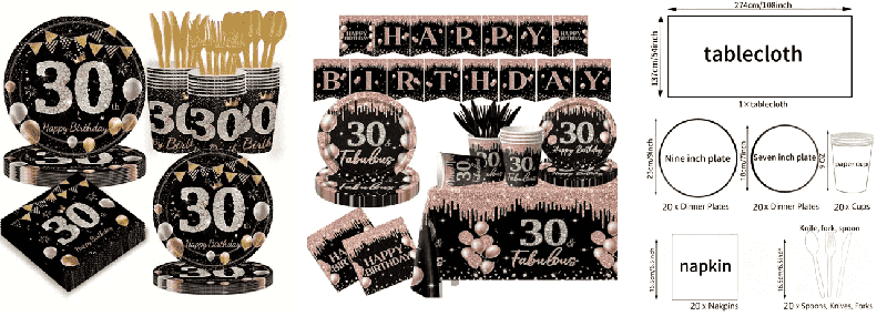 Popierinis gimtadienio atvirukas yra torto puošybos pagrindas: pagrindinis atvirukas paremtas tokiais žodžiais kaip „Su 30-uoju GIMTADIENIU“ ir yra derinamas su šampano puodelio forma. Dydis didelis ir tinka pagrindiniam tortui papuošti. Taip pat yra apskritas "30" logotipas, žvaigždės, karūnėlės ir kitos mažos kortelės, tinkamos keksiukai, pagamintos iš sutirštinto kieto kartono, su bambuko pagaliukais apačioje, kuriuos galima įsmeigti naudojimui.
