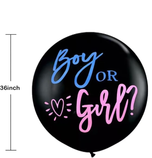 Dėl36 colių lyties atskleidimo balionassandėlyje, jis yra matinės juodos spalvos ir turi daug spausdinimo stilių, pavyzdžiui, berniuko ar mergaitės, berniuko ir mergaitės personažų paveikslėlis ar kažkas kitas, susijęs su berniuku ir mergina. Konfeti vienas maišelis yra rožinis popierinis konfeti su folijos aukso spalvos konfeti, kitas maišelis yra mėlynas popierinis konfeti su folijos aukso spalvos konfeti.