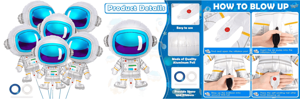 Astronauto folijos balionų rinkinys yra mažas ir išskirtinis, patogus ir lengvas. Jis pastato astronautą į vakarėlio centrą, o jį supa planetos balionas. Žvaigždės traukia gėles iš abiejų pusių be sudėtingų įrankių. Mažas kostiumas tinka kasdieniam nedidelių šeimos gimtadienių ir vaikų kambarių dekoravimui. Tai šviesus erdvės vėjo laikrodžio taškas.