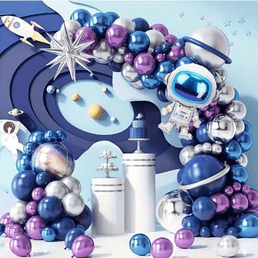 Astronautų folijos balionų girliandų rinkinys yra akį traukiantis ginklas didelės apimties veiklai, tinkamas vakarėlio foninei sienai, prekybos centro veiklos įėjimo išplanavimui. Naudojant baliono grandinę kaip pagrindą, astronauto spausdinimo balionas, raketos folijos balionas, spalvotas planetos balionas ir matinis latekso balionas yra įsiterpę ir pritvirtinti. Vainiko kostiumą galima kabinti tiesiai ant sienos arba durų staktos. Giliai žvaigždėto dangaus spalvų sistema derinama su ryškiu metaliniu blizgesiu, kuris akimirksniu užpildo svaiginančią erdvės atmosferą ir tampa vizualiu veiklos vietos akcentu.