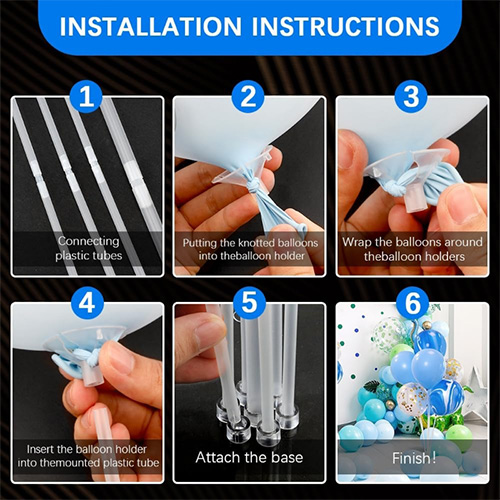 Kaip parodyta 2 paveiksle ir 3 paveiksle žemiau, pirmiausia padalykite įvairius aksesuarų balionų grindų stovą į kategorijas ir nustatykite kiekvieno priedo surinkimo padėtį. Tada plastikinis vamzdelis yra sujungtas per jungtį, tada mazgo balionas dedamas į baliono atramos skylę, baliono mazgas susukamas ir ištraukiamas į kitą jungties skylę, o pagaliau baliono atrama yra sujungta su vamzdeliu, o kitas vamzdžio galas yra sujungtas su pagrindu su klijais. Padarytas gražus baliono stendas. Be to, surinktą baliono vilkimo stulpą taip pat galima lengvai išardyti ir gali būti naudojamas kaip „Balloon Stand Holder Stick“ žaislas vaikams, realizuojant daugybę vieno stulpo naudojimo ir lankstaus naudojimo. Be to, surinktą baliono grindų stovas taip pat gali būti naudojamas su spalvotais žibintais. Jei jums patinka spalvotos lemputės, galite nusipirkti spalvotų žibintų pirkdami balionų grindų stovas, kad jūsų veikla taptų spalvingesnė!