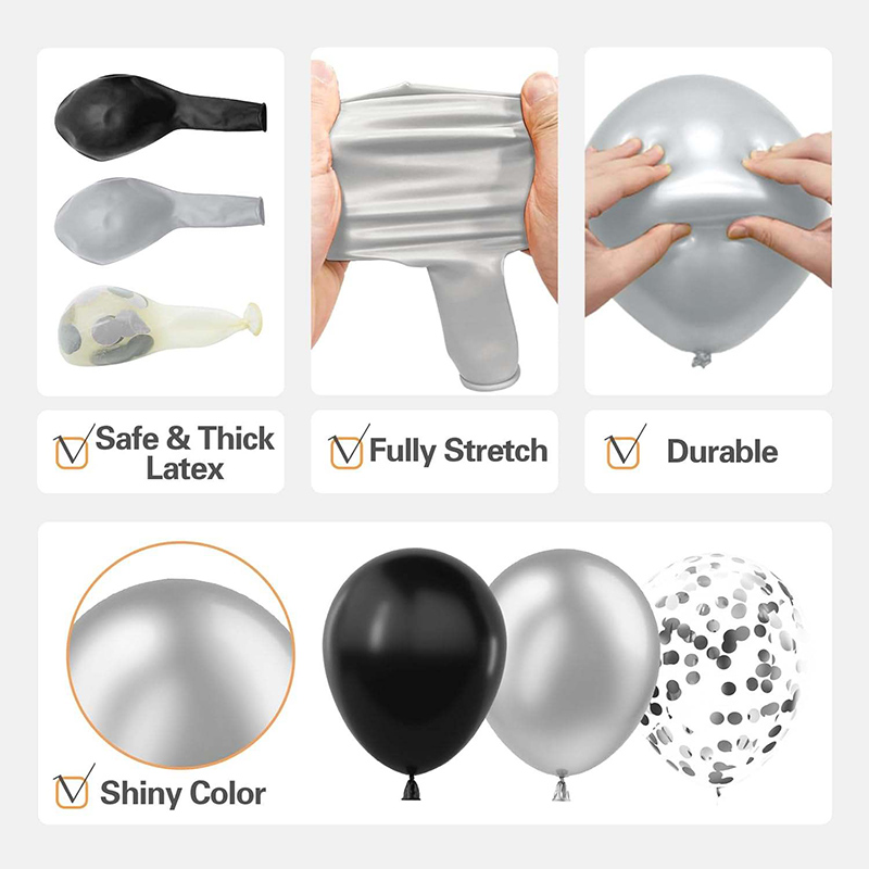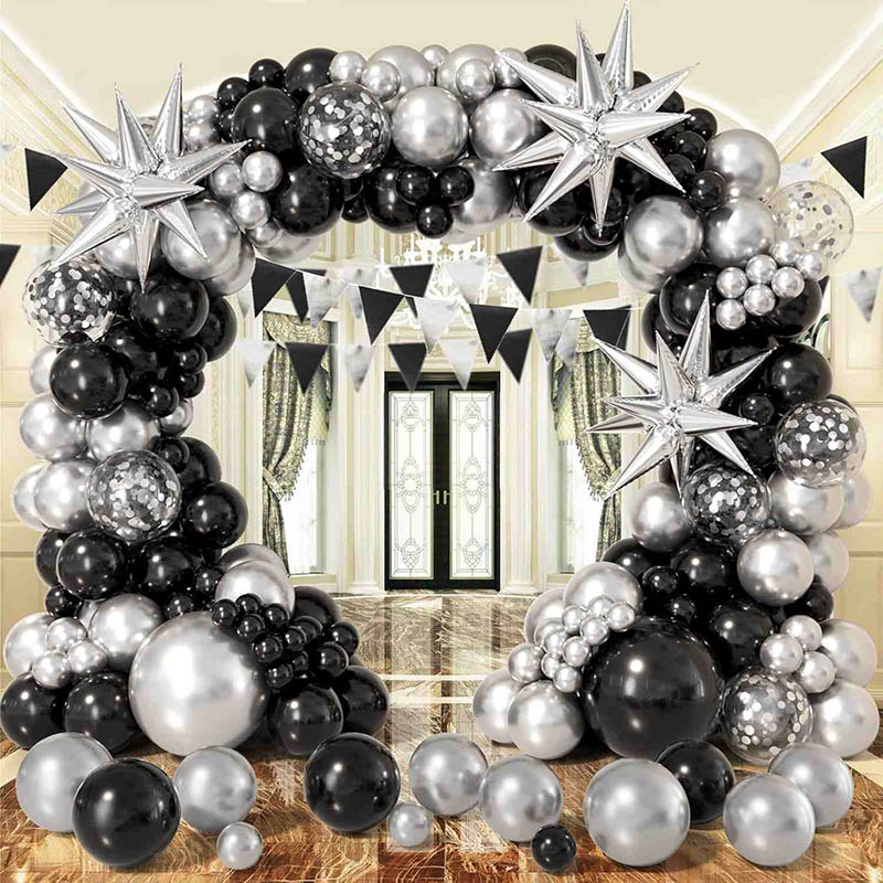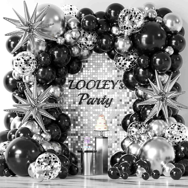 4. Privatūs ir išskirtiniai pritaikyti juodos ir sidabrinės spalvos balionų girliandų rinkiniai.