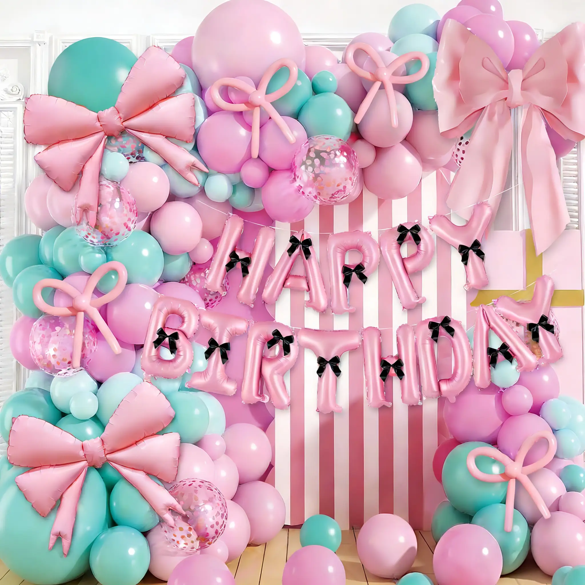 Šį rinkinį sudaro macaroon rožinė, macaroon Tiffany mėlyna, macaroon rose raudona, matinė odos rožinė ir matinė Tiffany mėlyna spalvos. Jis turi 5 colių, 10 colių, 12 colių ir 18 colių balionus. Klijų taškas ir baliono juostelė gali padėti jūsų galutiniams klientams lengvai surinkti šį rinkinį. Folijinis lankelis, juodas kaspinas ir 260 ilgio balionas yra šio rinkinio akių dalys.