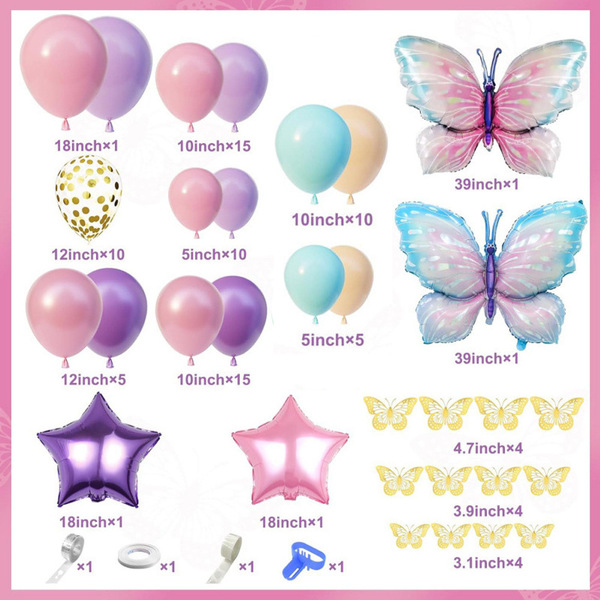Drugelio balionų girliandos komplektą daugiausia sudaro lateksiniai balionai, jie būna įvairių dydžių (5 colių, 10 colių, 12 colių ir 18 colių). Jų spalvose dažniausiai dominuoja rožinė, mėlyna, violetinė ir kt. Norėdami sustiprinti rinkinio sluoksniavimosi efektą, taip pat galite pamatyti permatomus latekso balionus ir konfeti latekso balionus. Kaip rinkinio tema, drugelių folijos balionai taip pat yra būtini. Dauguma jų spalvų yra ryškios (mėlyna / rožinė / violetinė...), o vidutinis dydis yra 18–30 colių (galimi pasirinktiniai dydžiai). Be to, jie turi labai tikrovišką išvaizdą, kuri yra beveik tikroviška.