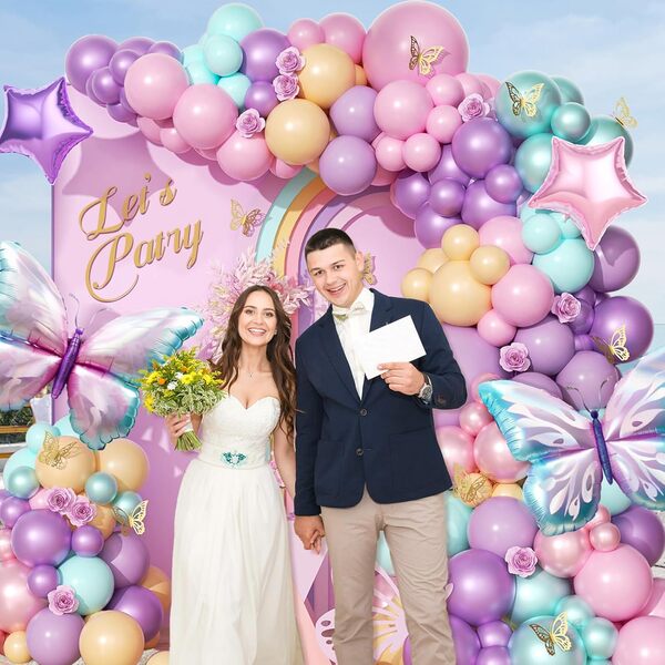 Drugelio balionų arkos rinkinys: Arkos rinkinys yra spalvingas ir traukiantis akį, jį sudaro įvairūs folijos balionai ir latekso balionai. Ją sutvarkydami pridėkite fono lentą su raštais ir skirtingu tekstu, tada aplink ją apjuoskite balionus. Tai renginio atmosferos kūrėjas. Fotografuojant prieš jį atrodys labai gražiai.