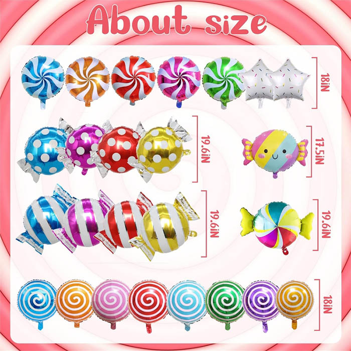 Saldainių folijos balionas yra maždaug 18 colių dydžio ir tinkamo dydžio. Nesvarbu, ar jis derinamas su balionų girliandos arkos rinkiniu, ar kaip nedidelio šeimos vakarėlio puošmena, jis gali harmoningai susimaišyti, neatrodydamas staigus. Šis folijos balionas yra šviesiai mėlynos, šviesiai rožinės, rožinės raudonos, šviesiai žalios, geltonos ir kt. Įvairių formų saldainių folijos balionų užtenka sukurti stiprią ir mielą atmosferą bei nustebinti desertų parduotuves mėgstančius draugus.