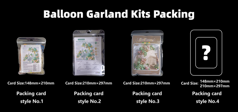 Balionų arkos rinkinių pakavimas priklauso nuo jūsų pardavimo progos. Jei parduodate jį internetu, toliau nurodytas pakavimo būdas Nr.1 ir vakuumas jums bus naudingas, tai gali padėti sutaupyti vietos ir sutaupyti siuntimo išlaidas. Bet jei parduotuvėje parduodate pritaikytus spalvingus balionų arkų rinkinius, jums tiks didesnis pakavimo maišelis, kurio pakavimo stilius Nr. 2 arba didesnis, o didesnis pakavimo maišelis su skirtingų stilių spalvingų balionų arkų rinkinių kortelėmis gali geriau parodyti gaminius ir parodyti savo klientams. Bet jei norite pritaikyti savo pakavimo stilių, tai taip pat gerai, galite pasakyti mums savo reikalavimus, mūsų dizaineris tai padarys už jus. Arba jūs sukuriate dizainą ir atsiunčiate mums galutinį dizainą, mūsų darbuotojai pagal jūsų poreikius pagamins aukštos kokybės spalvingų balionų arkų komplektų dekoracijas.