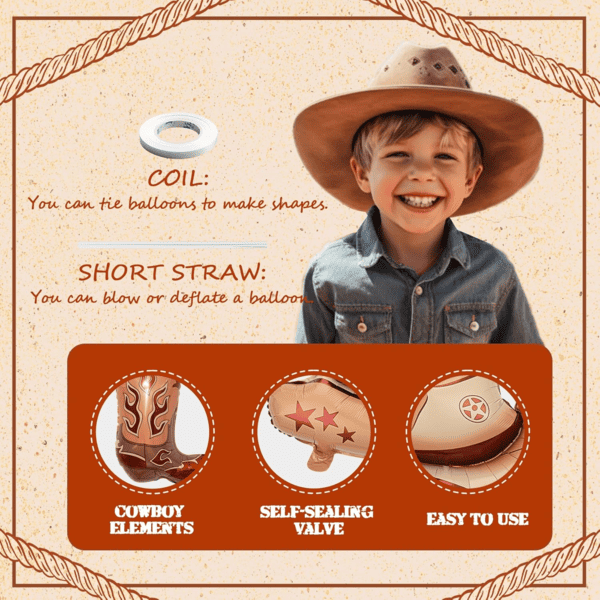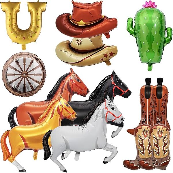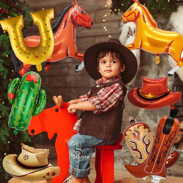 Įvairių dizainų – nuo mielų kepurių ir batų iki žaismingų žirgų, pasagų ir tikroviškų kaktusų: šie gaminiai puikiai tinka teminiams vakarėliams, filmų vakarams, gimtadieniams ir įvairiems šventiniams renginiams.Kaubojiški folijos balionaiyra pagaminti iš specialiai sukurtos aukštos kokybės kompozicinės plėvelės.Ji yra elastinga ir mažai tikėtina, kad sprogs. Taip pat galite pakartotinai jį naudoti kelis kartus po tinkamo laikymo. Jie yra ryškių spalvų ir turi didelę išraiškos galią. Juos galite naudoti kurdami įvairius derinius.Pavyzdžiui, naudojant 5-10 vnt folijos balionų (arkliukų, skrybėlių modelių, batų modelių..), ir 60vnt rudos, baltos, juodos spalvos latekso balionų ir kitų priedų (fono, banerių...) kaubojaus folijos balionų girliandos komplektui. Jis gali suteikti jūsų vakarėliui stipraus amerikietiško vakarietiško skonio, leisdamas pasijusti taip, lyg būtumėte kaubojus. Jį galite naudoti per gimtadienius, šventes ar renginius. Jei esate vakarietiškų filmų gerbėjas, ši tema jums puikiai tiktų. Galima įsigyti masinių kaubojiškų vakarėlių balionų, kurie padės sumažinti išlaidas ir padidinti perpardavimo pelną, todėl jie yra geriausias pasirinkimas renginių planuotojams, vakarėlių reikmenų parduotuvėms ir perpardavėjams.