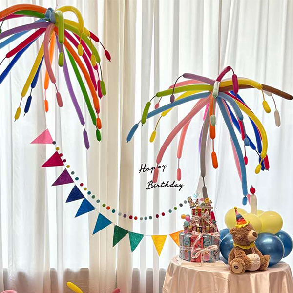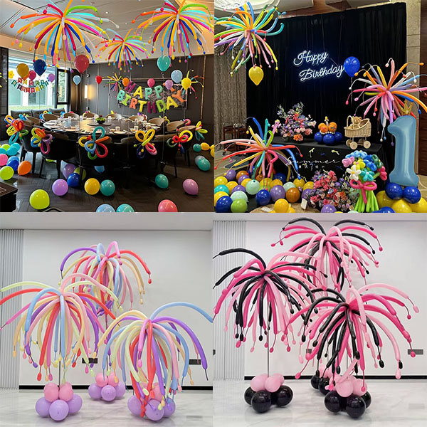 Forma dizainui. Įkvėpimas kyla iš fejerverkų, sprogusių naktiniame danguje. Jie yra ryškūs, dinamiški ir patraukliai. Tai puikiai kopijuoja fejerverkų formą, kai jie sprogo. Ilgos baliono juostos ištemptos ir pasklido iš centro. Maži balionai pridedami galuose. Jie atrodo kaip kibirkštys iš sprogstančių fejerverkų. Gyvybingas ir ryškus. Pakabinkite juos ant vakarėlių lubų. Arba padėkite juos ant žemės kaip dekoratyvinės kolonos. Jie sukuria gražų vaizdinį fejerverkų, iškart sprogusių, efektą. Vakarėlių svečiai jausis tarsi dalyvautų fejerverkų šou. Panardintas į laimingą ir gyvą atmosferą. Be to, balionų bazė apačioje yra gerai suplanuota. Fejerverkų formos balionai su skirtingomis spalvų rungtynėmis. Jų bazėse naudojami suderinami balionų deriniai. Bazė palaiko balioną stabilų. Tai taip pat sustiprina bendrą dekoratyvinį grožį. Padaro visą fejerverkų formos balioną, integruotą iš viršaus į apačią. Tampa gražiu reginiu vakarėlyje.