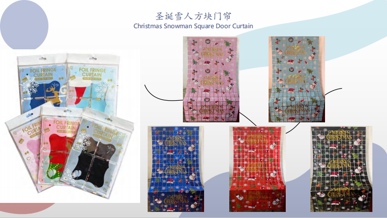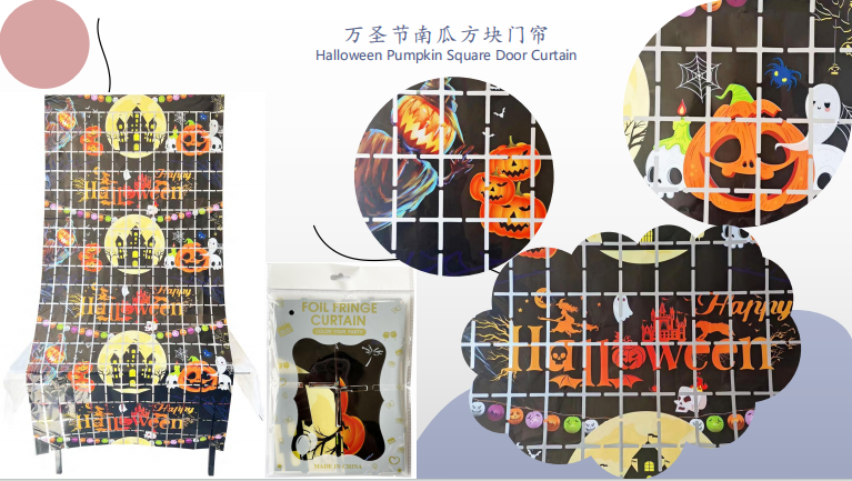 Tokios kaip kalėdinės temos žalios ir raudonos folijos užuolaidos, Helovino tematikos juodos ir oranžinės folijos užuolaidos bei folijos užuolaidos su moliūgais, šikšnosparniais, vorais ir kitomis formomis, kurias galima naudoti atostogų dekoravimui namuose, prekybos centruose, baruose ir kitose vietose.