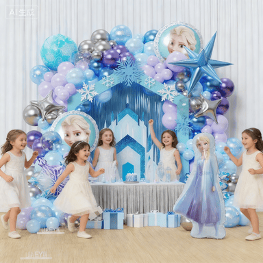 Frozen tematikos balionų arkos rinkinys kaip Disney stiliaus gaminys, pamėgtas vaikų ir suaugusiųjų visame pasaulyje.