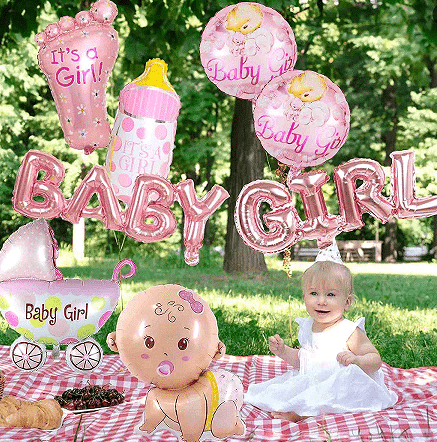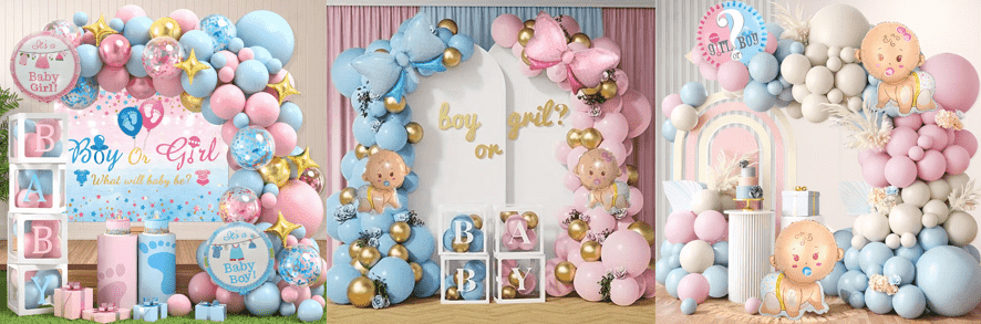 Pagrindinis balionų rinkinys daugiausia suderinamas su dviem pagrindinėmis rožinės ir mėlynos spalvos spalvomis, o kai kurie blizgučiai ir raidžių aliuminio balionai pridedami kaip dekoracija.