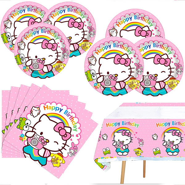 3) Stalo reikmenys: Hello Kitty indai vis tiek gali būti derinami su išskirtinio rašto rožinės ir baltos spalvos vakarėlio reikmenų rinkiniu, kad sukurtumėte mielą atmosferą jūsų vakarėliui. Visi gaminiai yra labai patvarūs, ryškių spalvų ir kokybiškai jaučiasi.