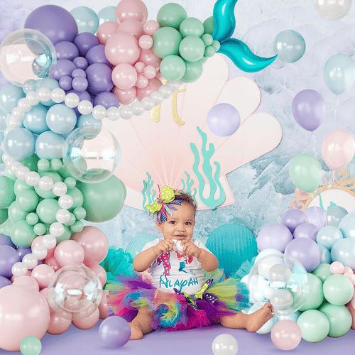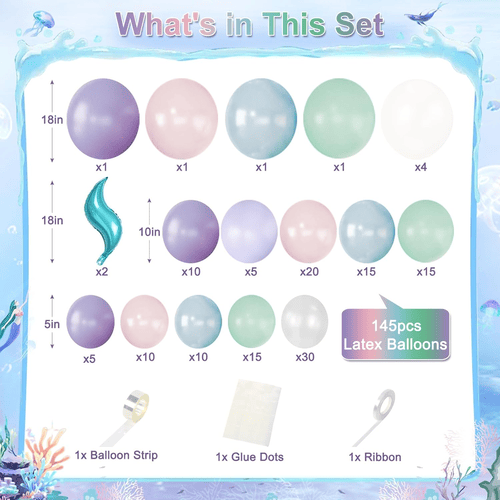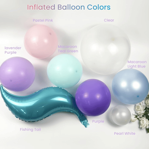 „Mermaid“ balionų girliandos balionai yra įvairių spalvų, tokių kaip violetinė, levandų, pastelinė rožinė, šviesiai mėlyna, žalsvai žalsva, perlamutrinė ir skaidri, kartu su folijos undinės uodegos dekoracijomis, todėl puikiai tinka kuriant stebuklingą undinės vandenyno vakarėlį.