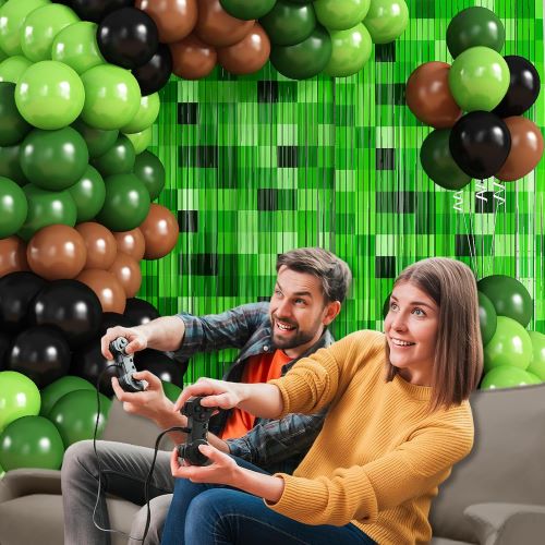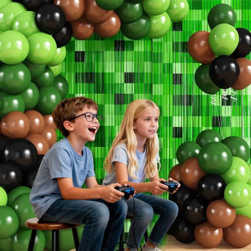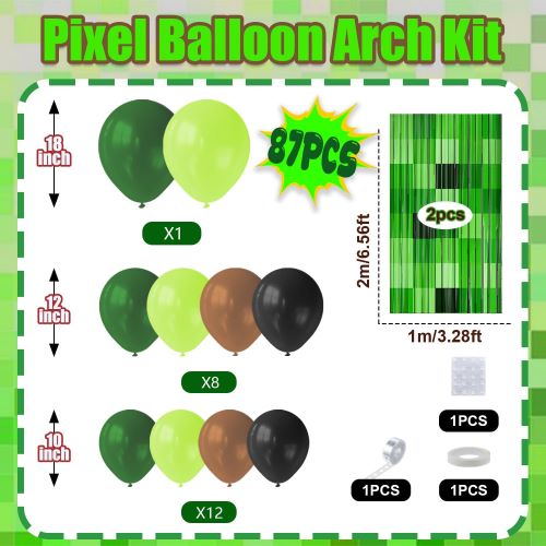 Įkvėptas minecraft vaizdo žaidimų, šis patvarus minecraft balionų arkos rinkinys sujungia įvairių atspalvių žalius pikselių balionus su minecraft tematikos vakarėlio fonais, kad sukurtų žaismingą daugiasluoksnį vaizdą, perteikiantį klasikinių nuotykių žaidimų žavesį.