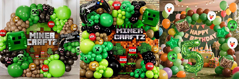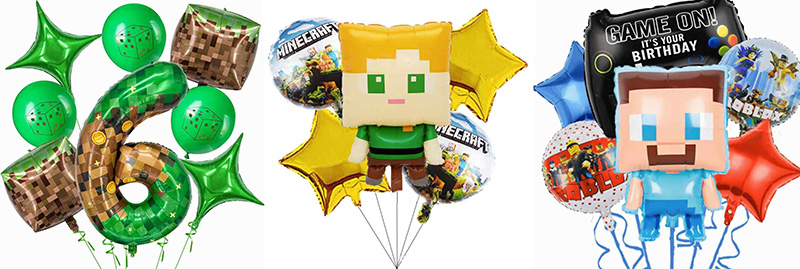 „Minecraft“ folijos balionų balionų rinkiniai yra skirti lengviems vakarėliams ar mažiems susibūrimams. Jie sumaišo skirtingus folijos balionų stilius arba suporuoja juos su nedaugeliu latekso balionų, kad sukurtų rinkinius. „Charakterio + daikto“ rinkinyje yra Steve'o balionų, deimantinio kardų balionų ir apvalių temų balionų. „Number + Scena“ rinkinyje yra numerio balionai ir žolių blokiniai balionai. Balionai komplektuojami vieni su kitais. Galite greitai atrodyti tema be jokių papildomų pastangų.