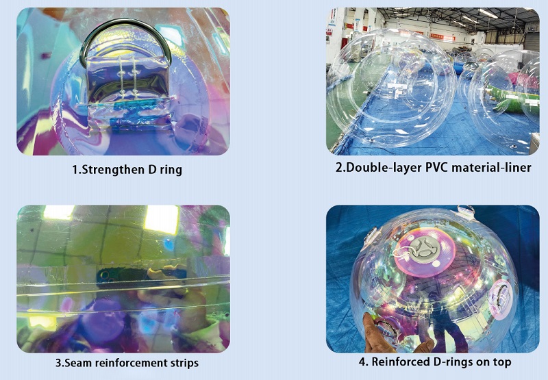Dvigubo sluoksnio struktūra- pripučiamaVeidrodinis rutulyssusideda iš vidinio pamušalo (0,4 mm PVC) ir išorinio apvalkalo (0,3 mm veidrodinės medžiagos). Ši struktūra daro produktą daugkartinio naudojimo, gali būti išpūstas kelis kartus ir užtikrina stiprų hermetiškumą, kai jis naudojamas žemoje ir aukštoje temperatūros aplinkoje.