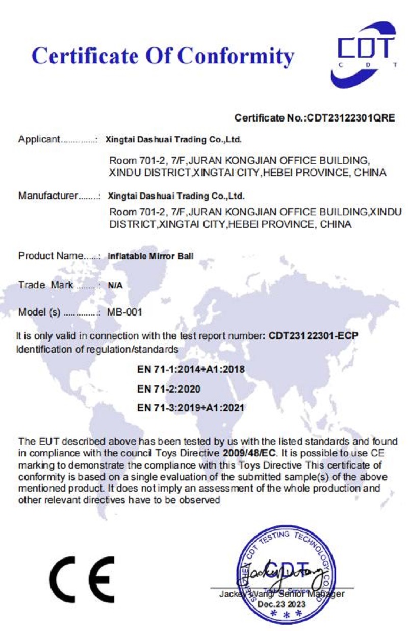 Daugiausia iš dvigubo sluoksnio patvarios PVC medžiagos, paviršius yra specialiai apdorotas taip, kad sudarytų veidrodinį efektą, kuris gali atspindėti aplinkinę šviesą ir sukurti fantastišką vaizdinį efektą. Ši sfera yra ne tik lengva, lengvai gabenama ir montuojama, bet ir tvirta ir tinkama įvairioms lauko ir vidaus aplinkai. Be to, „Mirror Ball“ yra įvairių spalvų ir gali būti pritaikytas skirtingomis spalvomis ar raštais pagal renginio temą, kad patenkintų skirtingų klientų poreikius.