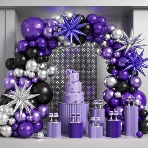 Violetinių ir juodų balionų girliandų rinkiniai yra vienas populiariausių stilių mūsų balionų girliandų rinkiniuose. Balionų arkos girlianda apima5 colių, 10 colių ir 18 colių matinės violetinės spalvos balionai, 5 colių, 10 colių ir 18 colių matinės juodos spalvos balionai,10 colių metaliniai sidabriniai balionai, 12 colių sidabriniai konfeti balionai ir balionų aksesuarai, klijuojantys taškus, balionų grandinėlę, juostelę ir pan.