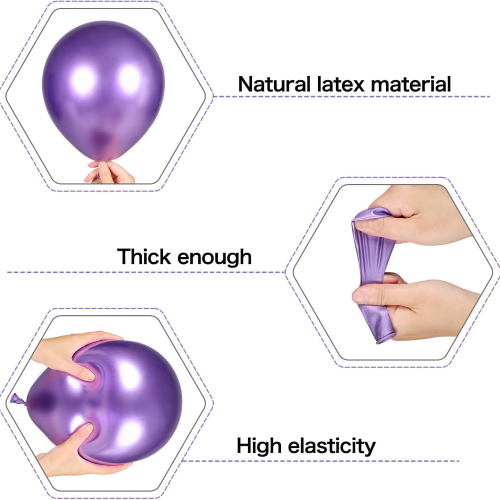 Mūsų purpurinių ir juodų balionų girliandų rinkinių kiekis ir svoris yra daugiau nei kitų prekių ženklų. Kiekviename mūsų balionų girliandos arkos rinkinyje yra mažiausiai 100 balionų. Kiekvienas mūsų siūlomo dydžio balionas naudoja standartinį pramonės gramų svorį. Pavyzdžiui, 12 colių balionų svoris gramais yra 2,8 g. Taip pat galime pakoreguoti baliono svorį gramais, jei turite specialių reikalavimų. Kaip matote iš toliau pateiktų paveikslėlių, užtenka vieno iš mūsų balionų rinkinio, kad lengvai sukurtumėte stilingą ir atmosferišką vakarėlio sceną.