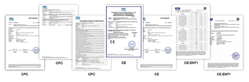 Visas mūsų gaminių asortimentas išlaikė CPC, CE, EN71 ir kitus patikimus sertifikatus, griežtai laikantis Europos ir Amerikos bei kitų tikslinės rinkos saugos taisyklių. Šios kvalifikacijos gali padėti jūsų prekėms sklandžiai atlikti muitinės formalumus ir visiškai išvengti atitikties rizikos užsienio rinkose.