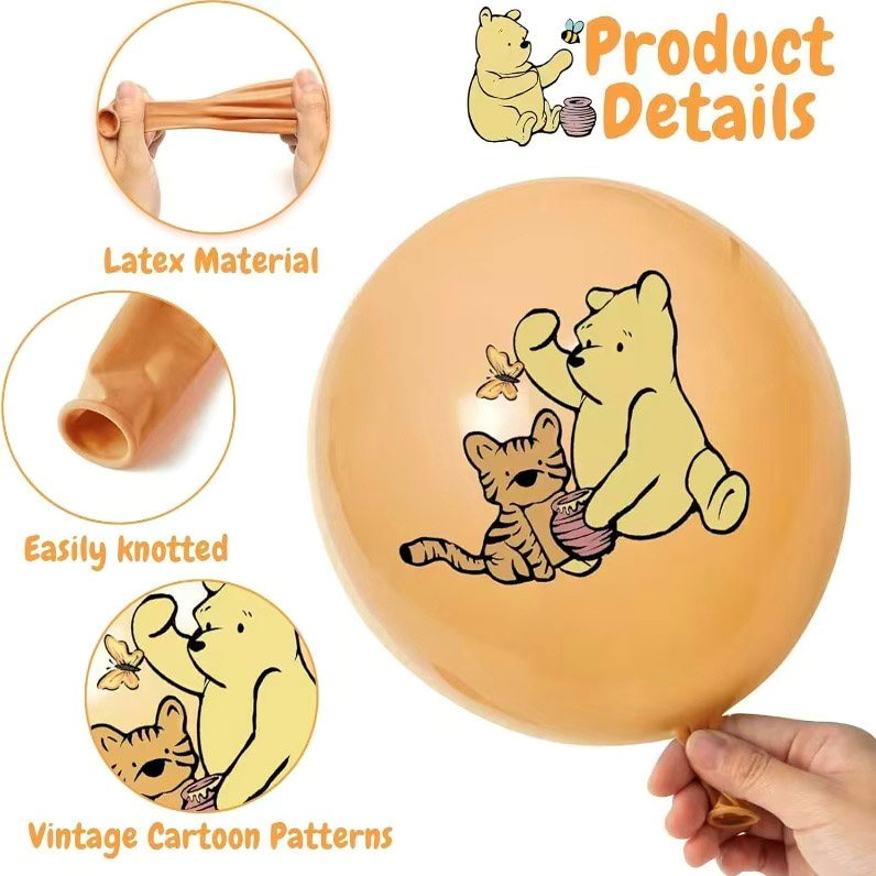 Mikė Pūkuotukaslatekso balionaituri daug žinomų personažų. Yra Mikė Pūkuotukas, Paršelis, Eeyore ir kiti. Mažos bitės taip pat skraido aplink puodą. Visa tai ant balionų iškėlė laimingą Šimto akrų miško sceną. Kiekvienas raštas kruopščiai nukopijuoja animacijos detales. Miela Mikės Pūkuotuko išvaizda išsiskiria ant balionų. Paršelio žaismingas stilius taip pat išsiskiria. Jie priverčia žmones iš karto prisiminti savo vaikystę. Vaikai gali mėgautis šio IP žavesiu. Tuo gali džiaugtis ir tėvai.